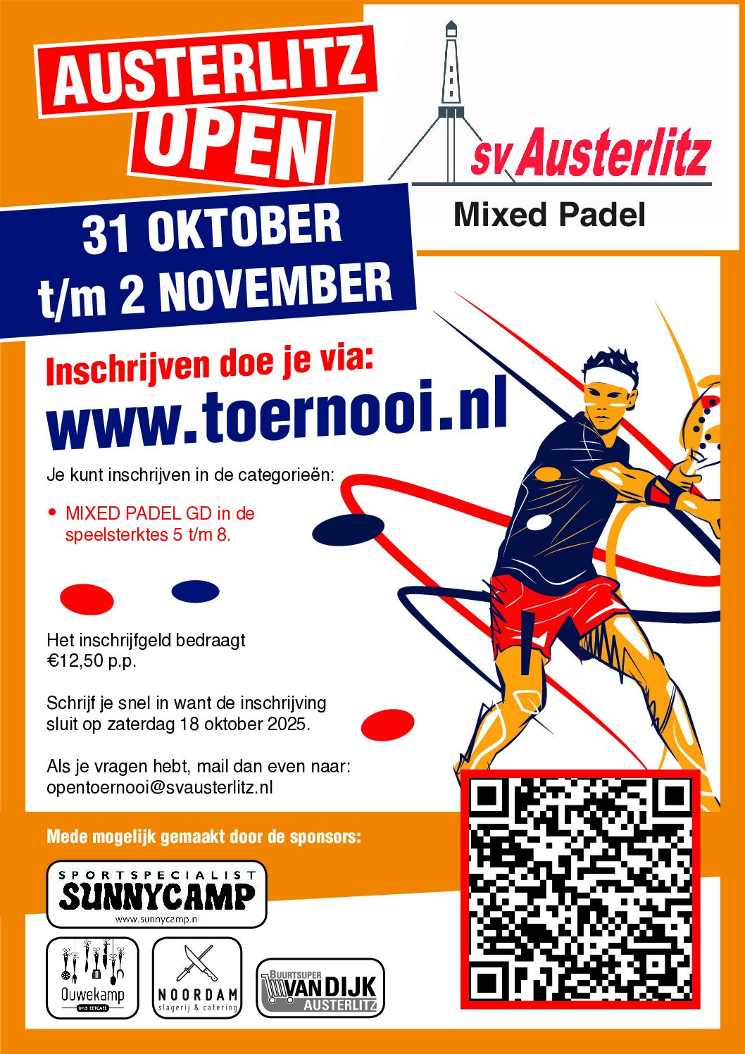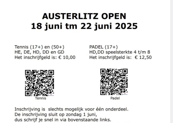 SV Austerlitz organiseert dit jaar weer het open Padel- en Tennistoernooi van woensdag 18 tot zondag 22 juni 2025. Organisatorisch zijn het 2 aparte toernooien waarvoor je je ook separaat kunt inschrijven. Het padeltoernooi (17+) is voor HD, DD en…