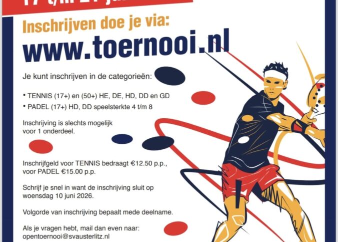 Ook dit jaar organiseert onze sectie tennis/padel weer het Austerlitz Open editie 2026 van woensdag 17 t/m zondag 21 juni. Dit padel en tennistoernooi is de afgelopen 10 jaar in de regio gegroeid tot een succesvol en gezellig toernooi met…