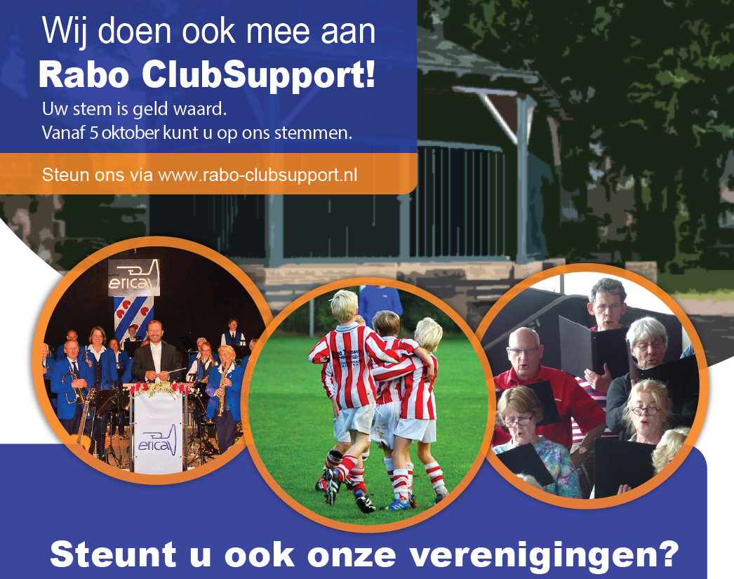 Met Rabo ClubSupport steunt de Rabobank clubs en verenigingen uit de regio. En wij doen dit jaar ook mee! Zo maken we kans op een mooi bedrag wat onze vereniging en buurt beter en sterker maakt. Jouw stem is geld waard. Zorg daarom dat je lid bent van Rabobank. Stemmen kan van 5 tot 25 oktober 2020.