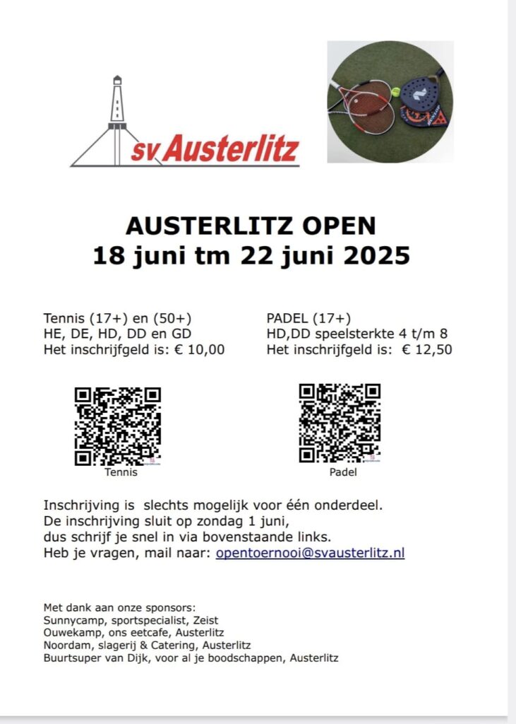 SV Austerlitz organiseert dit jaar weer het open Padel- en Tennistoernooi van woensdag 18 tot zondag 22 juni 2025. Organisatorisch zijn het 2 aparte toernooien waarvoor je je ook separaat kunt inschrijven. Het padeltoernooi (17+) is voor HD, DD en speelsterkte 4 t/m 8.